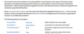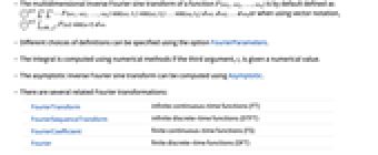 AccuracyGoal Automatic digits of absolute accuracy sought Assumptions $Assumptions assumptions to make about parameters FourierParameters {0,1} parameters to define the inverse Fourier sine transform GenerateConditions False whether to generate answers that involve conditions on parameters PerformanceGoal $PerformanceGoal aspects of performance to optimize PrecisionGoal Automatic digits of precision sought WorkingPrecision Automatic the precision used in internal computations - Common settings for FourierParameters include: