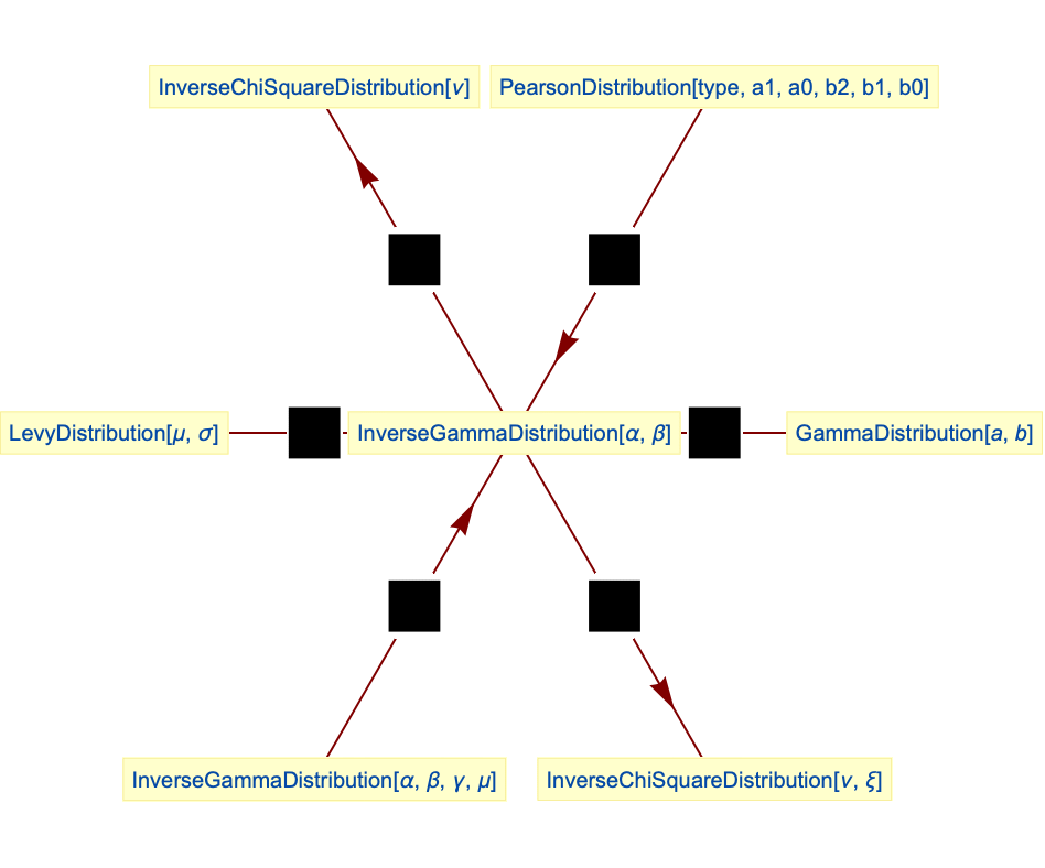 - InverseGammaDistribution is closely related to a number of other distributions. For example, InverseGammaDistribution is related to InverseChiSquareDistribution (and hence to ChiSquareDistribution) in that the PDF of InverseGammaDistribution[ν/2,1/2] is precisely the same as InverseChiSquareDistribution[ν,1/ν]. InverseGammaDistribution is generalized by PearsonDistribution, generalizes LevyDistribution, and is closely related to a number of other distributions including MoyalDistribution, LogGammaDistribution, ErlangDistribution, BetaDistribution, ExpGammaDistribution, RayleighDistribution, ChiDistribution, WeibullDistribution, and StudentTDistribution.