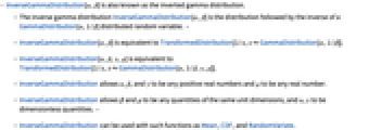 - InverseGammaDistribution[α,β,γ,μ] is equivalent to TransformedDistribution[1/x,xGammaDistribution[α,1/β,γ,μ]].