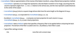 - InverseRadon operates on an image that represents a discrete Radon transform of an image, assuming that the columns represent angles from