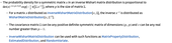 . - InverseWishartMatrixDistribution can be used with such functions as MatrixPropertyDistribution, EstimatedDistribution, and RandomVariate.