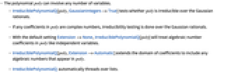 - With the default setting Extension->None, IrreduciblePolynomialQ[poly] will treat algebraic number coefficients in poly like independent variables.