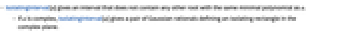 - If a is complex, IsolatingInterval[a] gives a pair of Gaussian rationals defining an isolating rectangle in the complex plane.