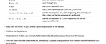 {s1,s2,…,sn} use s1 through sn; then use defaults {{c}} use c in all cases {{c1,c2}} alternate between c1 and c2 {{c1,c2,…}} cycle through all ci {s,{c}} use s, then repeatedly use c {s1,{c},sn} use s1, then repeatedly use c, but use sn at the end {s1,s2,…,{c1,c2,…},sm,…,sn} use the first sequence of si at the beginning, then cyclically use the ci, then use the last sequence of si at the end {s1,s2,…,{},sm,…,sn} use the first sequence of si at the beginning and the last sequence at the end - Rules have the form ispec, where i specifies a position in the dataset.