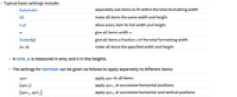 Automatic separately size items to fit within the total formatting width All make all items the same width and height Full allow every item its full width and height w give all items width w Scaled[s] give all items a fraction s of the total formatting width {w,h} make all items the specified width and height - In Grid, w is measured in ems, and h in line heights.