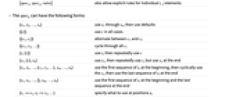 {s1,s2,…,sn} use s1 through sn; then use defaults {{c}} use c in all cases {{c1,c2}} alternate between c1 and c2 {{c1,c2,…}} cycle through all ci {s,{c}} use s, then repeatedly use c {s1,{c},sn} use s1, then repeatedly use c, but use sn at the end {s1,s2,…,{c1,c2,…},sm,…,sn} use the first sequence of si at the beginning, then cyclically use the ci, then use the last sequence of si at the end {s1,s2,…,{},sm,…,sn} use the first sequence of si at the beginning and the last sequence at the end {i1->v1,i2->v2,…} specify what to use at positions ik {spec,rules} use rules to override specifications in spec