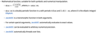 is the elliptic integral EllipticK.- JacobiDC is a meromorphic function in both arguments.