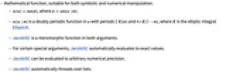 is the elliptic integral EllipticK.- JacobiSC is a meromorphic function in both arguments.