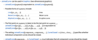 Line[{pt1,pt2,…}] lines BezierCurve[{pt1,pt2,…},…] Bézier curve BSplineCurve[{pt1,pt2,…},…] B-spline curve - The first point on segmenti is taken to be the last point on segmenti-1. JoinedCurve[{pr1[{p1,…,pi}],pr2[{q1,…,qj}],…}] is equivalent to JoinedCurve[{pr1[{p1,…,pi}],pr2[{pi,q1,…,qj}],…}].