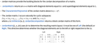 is UnitVector[n,i]. JordanDecomposition returns a block Jordan matrix of this form. » - JordanMatrix[λ,n,dir] uses dir to determine the resulting matrix layout. It must be one of Left (the default) or Right. This directive determines whether the diagonal elements are to the left or right respective to the 1s. »