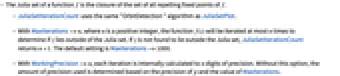 will be iterated at most n times to determine if z lies outside of the Julia set. If z is not found to lie outside the Julia set, JuliaSetIterationCount returns n+1. The default setting is MaxIterations->1000. - With WorkingPrecision->n, each iteration is internally calculated to n digits of precision. Without this option, the amount of precision used is determined based on the precision of p and the value of MaxIterations.