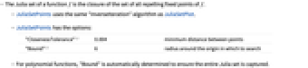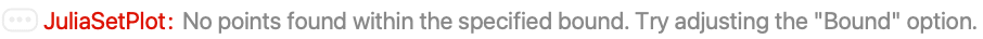 "ClosenessTolerance" 0.004 minimum distance between points "Bound" 6 radius around the origin in which to search - For polynomial functions, "Bound" is automatically determined to ensure the entire Julia set is captured.