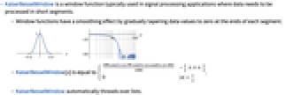 - KaiserBesselWindow is a window function typically used in signal processing applications where data needs to be processed in short segments.