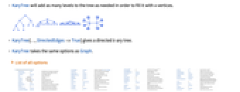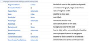 AlignmentPoint Center the default point in the graphic to align with AnnotationRules {} annotations for graph, edges and vertices AspectRatio Automatic ratio of height to width Axes False whether to draw axes AxesLabel None axes labels AxesOrigin Automatic where axes should cross AxesStyle {} style specifications for the axes Background None background color for the plot BaselinePosition Automatic how to align with a surrounding text baseline BaseStyle {} base style specifications for the graphic ContentSelectable Automatic whether to allow contents to be selected CoordinatesToolOptions Automatic detailed behavior of the coordinates tool DirectedEdges Automatic whether to interpret Rule as DirectedEdge EdgeLabels None labels and label placements for edges EdgeLabelStyle Automatic style to use for edge labels EdgeShapeFunction Automatic generate graphic shapes for edges EdgeStyle Automatic style used for edges EdgeWeight Automatic weights for edges Epilog {} primitives rendered after the main plot FormatType TraditionalForm the default format type for text Frame False whether to put a frame around the plot FrameLabel None frame labels FrameStyle {} style specifications for the frame FrameTicks Automatic frame ticks FrameTicksStyle {} style specifications for frame ticks GraphHighlight {} graph elements to highlight GraphHighlightStyle Automatic style for highlight GraphLayout Automatic how to lay out vertices and edges GridLines None grid lines to draw GridLinesStyle {} style specifications for grid lines ImageMargins 0. the margins to leave around the graphic ImagePadding All what extra padding to allow for labels etc. ImageSize Automatic the absolute size at which to render the graphic LabelStyle {} style specifications for labels Method Automatic details of graphics methods to use PerformanceGoal Automatic aspects of performance to try to optimize PlotLabel None an overall label for the plot PlotRange All range of values to include PlotRangeClipping False whether to clip at the plot range PlotRangePadding Automatic how much to pad the range of values PlotRegion Automatic the final display region to be filled PlotTheme $PlotTheme overall theme for the graph PreserveImageOptions Automatic whether to preserve image options when displaying new versions of the same graphic Prolog {} primitives rendered before the main plot RotateLabel True whether to rotate y labels on the frame Ticks Automatic axes ticks TicksStyle {} style specifications for axes ticks VertexCoordinates Automatic coordinates for vertices VertexLabels None labels and placements for vertices VertexLabelStyle Automatic style to use for vertex labels VertexShape Automatic graphic shape for vertices VertexShapeFunction Automatic generate graphic shapes for vertices VertexSize Medium size of vertices VertexStyle Automatic styles for vertices VertexWeight Automatic weights for vertices