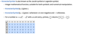 Wolfram Research (2007), KroneckerSymbol, Wolfram Language function, https://reference.wolfram.com/language/ref/KroneckerSymbol.html.