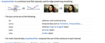 list arbitrary-rank numerical array tseries temporal data such as TimeSeries, TemporalData, … image arbitrary Image or Image3D object audio an Audio object video a Video object - For multi-channel data, KuwaharaFilter computes the sum of the variances in each channel.