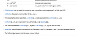- LCHColor[l,c,h,a] is equivalent to {LCHColor[l,c,h],Opacity[a]}.