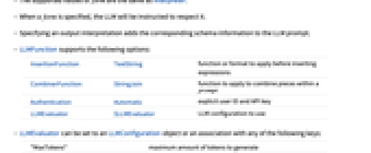 InsertionFunction TextString function or format to apply before inserting expressions CombinerFunction StringJoin function to apply to combine pieces within a prompt Authentication Automatic explicit user ID and API key LLMEvaluator $LLMEvaluator LLM configuration to use - LLMEvaluator can be set to an LLMConfiguration object or an association with any of the following keys: