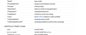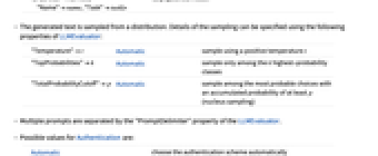 "MaxTokens" maximum amount of tokens to generate "Model" base model "PromptDelimiter" string to insert between prompts "Prompts" initial prompts "StopTokens" tokens on which to stop generation "Temperature" sampling temperature "ToolMethod" method to use for tool calling "Tools" list of LLMTool objects to make available "TopProbabilities" sampling classes cutoff "TotalProbabilityCutoff" sampling probability cutoff (nucleus sampling) - Valid forms of "Model" include:
