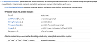 "text" static text LLMPrompt["name"] a repository prompt StringTemplate[…] templated text TemplateObject[…] template for creating a prompt Image[…] a static image (not supported by all LLMs) {prompt1,…} a list of prompts - Static content in prompt can be disambiguated using an explicit association syntax: