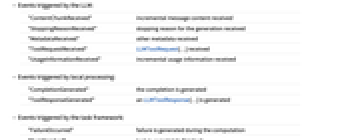 "ContentChunkReceived" incremental message content received "StoppingReasonReceived" stopping reason for the generation received "MetadataReceived" other metadata received "ToolRequestReceived" LLMToolRequest[…] received "UsageInformationReceived" incremental usage information received - Events triggered by local processing: