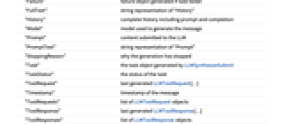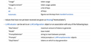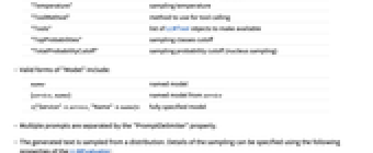 "MaxTokens" maximum amount of tokens to generate "Model" base model "PromptDelimiter" string to insert between prompts "Prompts" initial prompts or LLMPromptGenerator objects "StopTokens" tokens on which to stop generation "Temperature" sampling temperature "ToolMethod" method to use for tool calling "Tools" list of LLMTool objects to make available "TopProbabilities" sampling classes cutoff "TotalProbabilityCutoff" sampling probability cutoff (nucleus sampling) - Valid forms of "Model" include: