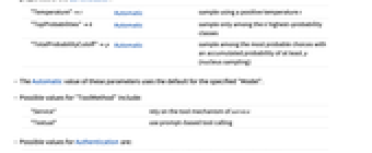 "Temperature"t Automatic sample using a positive temperature t "TopProbabilities"k Automatic sample only among the k highest-probability classes "TotalProbabilityCutoff"p Automatic sample among the most probable choices with an accumulated probability of at least p (nucleus sampling) - The Automatic value of these parameters uses the default for the specified "Model".