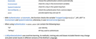 Automatic choose the authentication scheme automatically Environment check for a key in the environment variables SystemCredential check for a key in the system keychain ServiceObject[…] inherit the authentication from a service object assoc provide explicit key and user ID - With AuthenticationAutomatic, the function checks the variable ToUpperCase[service]<>"_API_KEY" in Environment and SystemCredential; otherwise, it uses ServiceConnect[service].