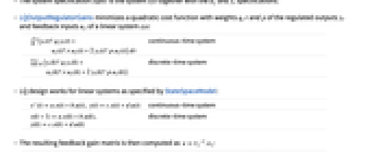 and x as input and uf as output "Design" type of controller design "DesignModel" model used for the design "FeedbackGains" gain matrix κ or its equivalent "FeedbackGainsModel" model gm with x as input and