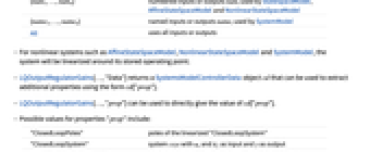 {num1,…,numn} numbered inputs or outputs numi used by StateSpaceModel, AffineStateSpaceModel and NonlinearStateSpaceModel {name1,…,namen} named inputs or outputs namei used by SystemModel All uses all inputs or outputs - For nonlinear systems such as AffineStateSpaceModel, NonlinearStateSpaceModel and SystemModel, the system will be linearized around its stored operating point.