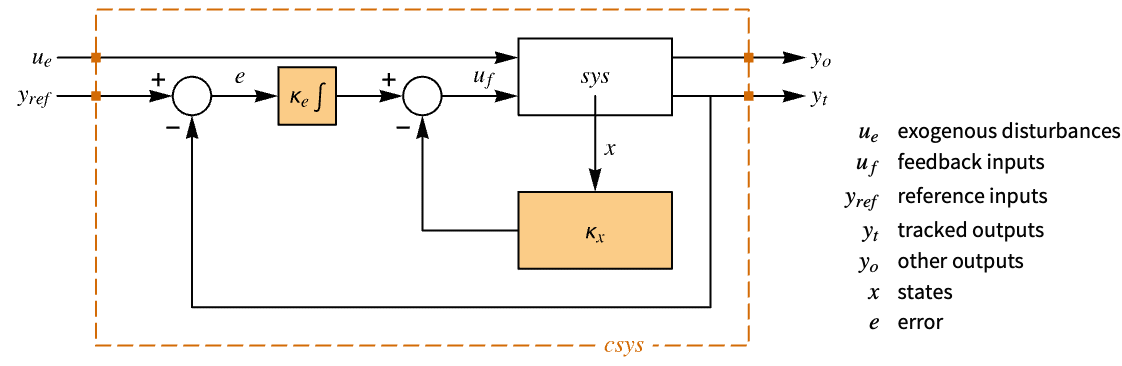 is the computed gain matrix for the augmented system that includes the system sys as well as the dynamics for