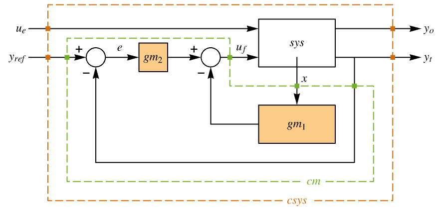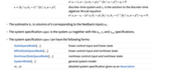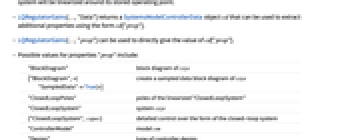 "BlockDiagram" block diagram of csys {"BlockDiagram",<|"SampledData"True|>} create a sampled data block diagram of csys "ClosedLoopPoles" poles of the linearized "ClosedLoopSystem" "ClosedLoopSystem" system csys {"ClosedLoopSystem", cspec} detailed control over the form of the closed-loop system "ControllerModel" model cm "Design" type of controller design "DesignModel" model used for the design "FeedbackGains" gain matrix κ or its equivalent "FeedbackGainsModel" model gm or {gm1,gm2} "FeedbackInputs" inputs uf of sys used for feedback "InputCount" number of inputs u of sys "InputModel" input model sys "OpenLoopPoles" poles of "DesignModel" "OutputCount" number of outputs y of sys "SamplingPeriod" sampling period of sys "StateCount" number of states x of sys "TrackedOutputs" outputs yt of sys that are tracked - Possible keys for cspec include:
