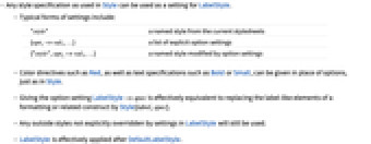 - Giving the option setting LabelStyle->spec is effectively equivalent to replacing the label-like elements of a formatting or related construct by Style[label,spec].