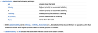 All always show the label Infinity highest priority for automatic labeling n relative priority for automatic labeling -Infinity lowest priority for automatic labeling Automatic priority determined by ordering None never show the label - With LabelVisibility set to Infinity, -Infinity, Automatic or n, the label will be shown if there is space to put it that does not collide with higher-priority labels or other graphical content.
