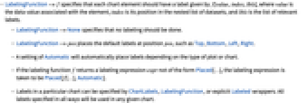 - LabelingFunction->f specifies that each chart element should have a label given by f[value,index,lbls], where value is the data value associated with the element, index is its position in the nested list of datasets, and lbls is the list of relevant labels.