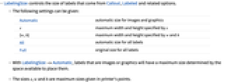 Automatic automatic size for images and graphics s maximum width and height specified by s {w,h} maximum width and height specified by w and h All automatic size for all labels Full original size for all labels - With LabelingSize->Automatic, labels that are images or graphics will have a maximum size determined by the space available to place them.