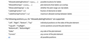 "AllowedLabelingPositions"{pos1,…} possible locations for labels "AllowedOverlaps"{elem1,…} plot elements that labels can overlap "AllowLabelClipping"clip whether the plot range can clip labels "LabelingFraction"lf fraction of elements to label "LabelOverlapFraction"of maximum allowed overlap between labels - The following positions posi for "AllowedLabelingPositions" are supported: