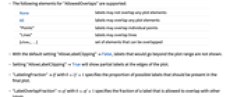 None labels may not overlap any plot elements All labels may overlap any plot elements "Points" labels may overlap individual points "Lines" labels may overlap lines {elem1,…} set of elements that can be overlapped - With the default setting "AllowLabelClipping"False, labels that would go beyond the plot range are not shown.