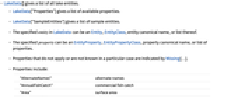 - LakeData["SampleEntities"] gives a list of sample entities.