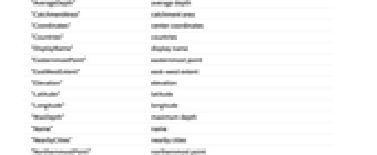 "AlternateNames" alternate names "AnnualFishCatch" commercial fish catch "Area" surface area "AverageDepth" average depth "CatchmentArea" catchment area "Coordinates" center coordinates "Countries" countries "DisplayName" display name "EasternmostPoint" easternmost point "EastWestExtent" east-west extent "Elevation" elevation "Latitude" latitude "Longitude" longitude "MaxDepth" maximum depth "Name" name "NearbyCities" nearby cities "NorthernmostPoint" northernmost point "NorthSouthExtent" north-south extent "OilRigs" oil rigs "Salinity" typical salinity "Shape" shape "ShoreLength" shoreline length "SouthernmostPoint" southernmost point "Volume" volume "WaterLevelFluctuation" water level fluctuation "WaterResidenceTime" water residence time "WesternmostPoint" westernmost point