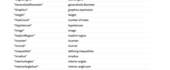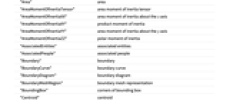 axis"AreaMomentOfInertiaZZ" polar moment of inertia "AssociatedEntities" associated entities "AssociatedPeople" associated people "Boundary" boundary "BoundaryCurve" boundary curve "BoundaryDiagram" boundary diagram "BoundaryMeshRegion" boundary mesh representation "BoundingBox" corners of bounding box "Centroid" centroid "Circumcenter" circumcenter "CircumcenterOfMass" circumcenter of mass "Circumcircle" circumcircle "Circumdiameter" circumdiameter "Circumradius" circumradius "Classes" classes "ConvexityCoefficient" convexity coefficient "DiagonalCount" number of diagonals "DiagonalizedAreaMomentOfInertiaTensor" diagonalized area moment of inertia tensor "DiagonalLengths" diagonal lengths "Diagram" diagram "EdgeCount" number of edges "EdgeLengths" side lengths "GeneralizedDiameter" generalized diameter "Graphics" graphics expression "Height" height "HoleCount" number of holes "Hypotenuse" hypotenuse "Image" image "ImplicitRegion" implicit region "Incenter" incenter "Incircle" incircle "Inequalities" defining inequalities "Inradius" inradius "InteriorAngles" interior angles "InteriorAngleSum" interior angle sum "LineOfSymmetryCount" number of lines of symmetry "LineSegmentLengthCDF" CDF of lengths "LineSegmentLengthMean" mean line segment length "LineSegmentLengthPDF" PDF of lengths "MajorAxis" major axis length (major diameter) "MinorAxis" minor axis length (minor diameter) "MeshRegion" mesh representation "Name" name "Parameters" parameters "Perimeter" perimeter "RadiiOfGyration" radii of gyration about coordinate axes "RadiusOfGyrationX" radius of gyration about the