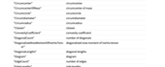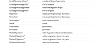 axis"SemimajorAxis" semimajor axis length (major radius) "SemiminorAxis" semiminor axis length (minor radius) "SportObjects" sport objects of given shape "TorsionalRigidityMultiplier" torsional rigidity multiplier for solid bar "TriangleAreaCDF" CDF of triangle areas "TriangleAreaMean" mean triangle area "TriangleAreaPDF" PDF of triangle areas "TriangulationCount" number of triangulations "VariableConstraints" variable constraints "VariableDescriptions" variable descriptions "Variables" variables "VertexCount" number of vertices "Vertices" vertices