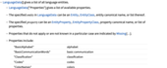 - LanguageData["Properties"] gives a list of available properties.