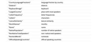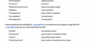 "BasicAlphabet" alphabet "BasicCommunicationWords" basic communication "Classification" classification "Codes" codes "ColorNames" colors "CountryLanguageFractions" language fraction by country "Dialects" dialects "KeyboardImage" keyboard "LargestCountry" place with most speakers "LetterFrequency" letter frequencies "Letters" characters "LexicalSimilarity" lexical similarity "MonthNames" months "Name" name "NativePopulation" number of native speakers "NonNativeTotalSpeakers" non-native total speakers "NumeralWords" numerals "OfficialSpeakingCountries" official speaking countries "PrimaryOrigin" original location "Pronouns" pronouns "RelativeCharacterCount" typical translation length "Speakers" native speakers "TotalSpeakers" total number of speakers "UnicodeBlock" Unicode blocks "WritingSystem" writing system - Some properties are available for LanguageData as a whole and can be given using the form LanguageData[property]. Such properties include: