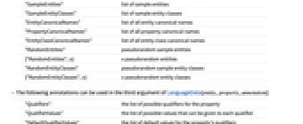"Entities" all available entities "EntityCount" total number of available entities "Classes" all available entity classes "EntityClassCount" total number of available entity classes "SampleEntities" list of sample entities "SampleEntityClasses" list of sample entity classes "EntityCanonicalNames" list of all entity canonical names "PropertyCanonicalNames" list of all property canonical names "EntityClassCanonicalNames" list of all entity class canonical names "RandomEntities" pseudorandom sample entities {"RandomEntities",n} n pseudorandom entities "RandomEntityClasses" pseudorandom sample entity classes {"RandomEntityClasses",n} n pseudorandom entity classes - The following annotations can be used in the third argument of LanguageData[entity,property,annotation]: