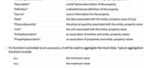 "Qualifiers" the list of possible qualifiers for the property "QualifierValues" the list of possible values that can be given to each qualifier "DefaultQualifierValues" the list of default values for the property's qualifiers "Description" a brief textual description of the property "Definition" a detailed textual definition of the property "Source" source information for the property "Date" the date associated with the entity-property value (if any) "PhysicalQuantity" the physical quantity associated with the entity-property value "Unit" the unit associated with the entity-property value "EntityAssociation" an association of entities and entity-property values "PropertyAssociation" an association of properties and entity-property values - If a function is provided as an annotation, it will be used to aggregate the result data. Typical aggregation functions include: