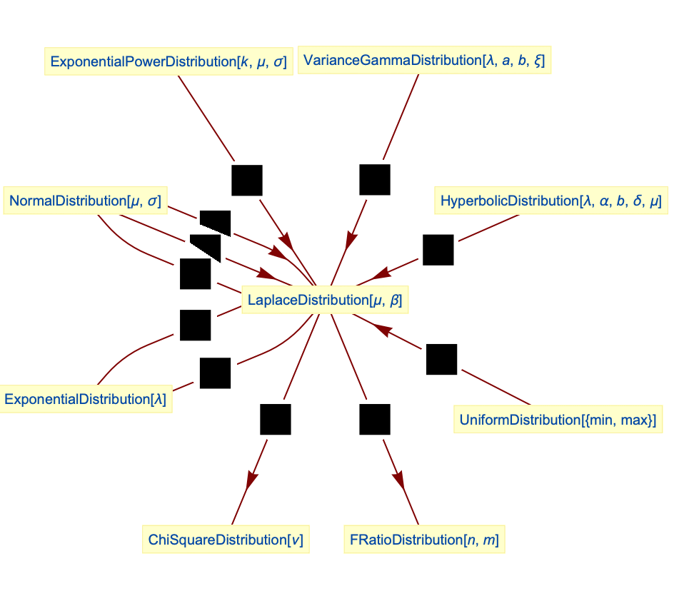 , and hence ExponentialDistribution can be obtained as a transformation (TransformedDistribution) of LaplaceDistribution. ChiSquareDistribution and FRatioDistribution are also transformations of LaplaceDistribution, while LaplaceDistribution can be obtained as a transformation of UniformDistribution, as a limiting case of HyperbolicDistribution (in the sense that the PDF of LaplaceDistribution[μ,β] is precisely the same as that of HyperbolicDistribution[1/β,0,δ,μ] as
