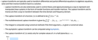 - Laplace transforms are typically used to transform differential and partial differential equations to algebraic equations, solve and then inverse transform back to a solution.