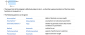 AccuracyGoal Automatic digits of absolute accuracy sought Assumptions $Assumptions assumptions to make about parameters GenerateConditions False whether to generate answers that involve conditions on parameters Method Automatic method to use PerformanceGoal $PerformanceGoal aspects of performance to optimize PrecisionGoal Automatic digits of precision sought PrincipalValue False whether to find Cauchy principal value WorkingPrecision Automatic the precision used in internal computations - Use GenerateConditions"ConvergenceRegion" to obtain the region of convergence for the Laplace transform.