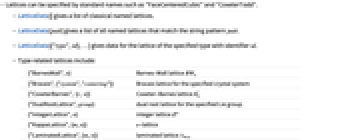 {"BarnesWall",n} Barnes–Wall lattice BWn {"Bravais",{"system","centering"}} Bravais lattice for the specified crystal system {"CoxeterBarnes", {r, n}} Coxeter–Barnes lattice